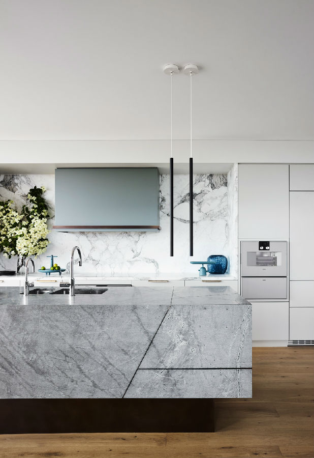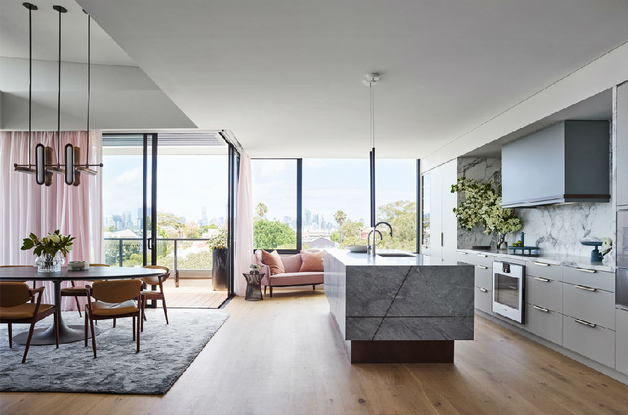 随着大量光线从全高的窗户和天窗涌入公寓,营造人性化的用餐、休闲和娱乐区域是关键。整洁和看似多余的细木工是温暖和邀请感谢使用触觉完成。纪念石岛界定厨房直接回应客户的简短,以高度现代的生活经验。