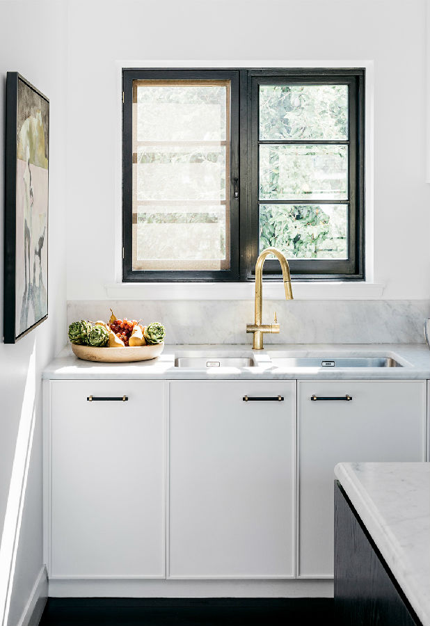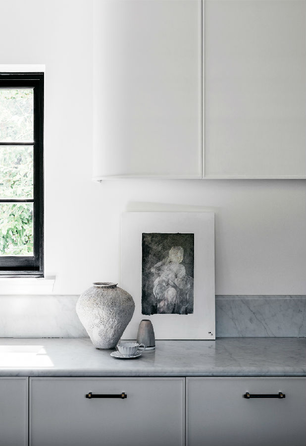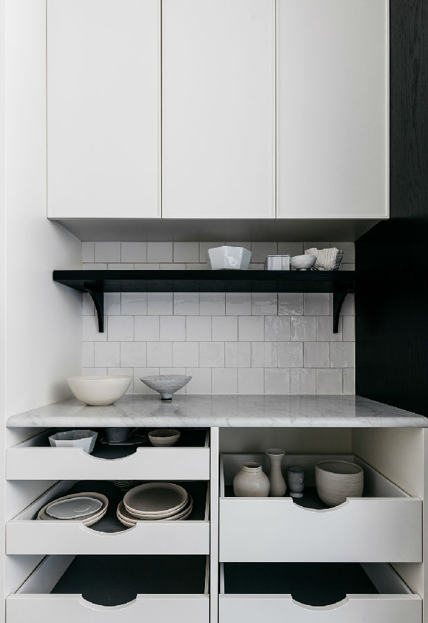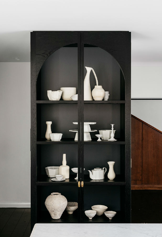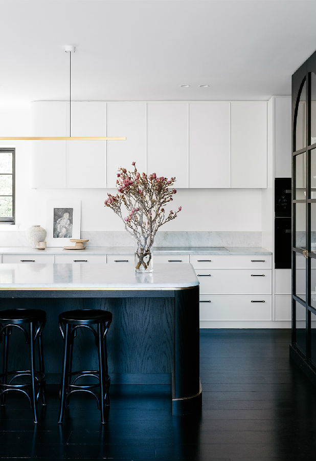 厨房现在功能强大,看起来毫不费力。一个大型的大理石岛和一个定制的展示柜,由房子的建筑知识,提供视觉焦点和作为分隔元素,厨房的厨房和工作部分在视线之外。